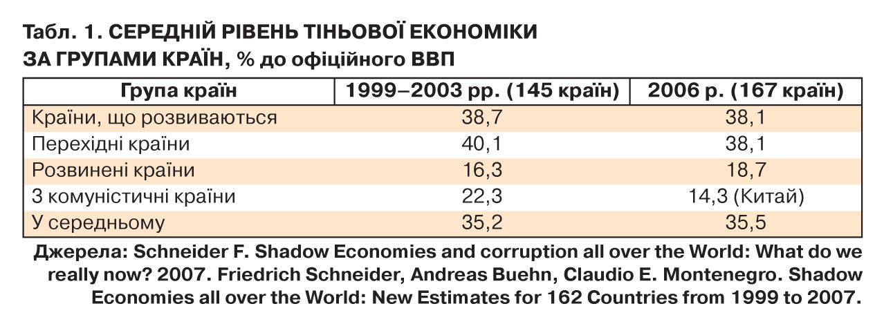 У світовому рейтингу Україна за обсягом тіньової економіки перебуває десь посередині, що видно з табл. 1.