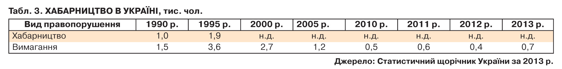 Приміром, такий злочин із категорії корупційних, як хабарництво: особа, що дала хабара, за певних умов несе кримінальну відповідальність. Чи виправдано це? Через чинний закон про хабарі злочинцями вважаються одночасно й той, хто дає хабара, і його одержувач. Виникає якась кругова порука: рука руку миє. Цікаво, що Держстат перестав публікувати дані про хабарництво, очевидно, у запалі боротьби з тіньовою економікою.