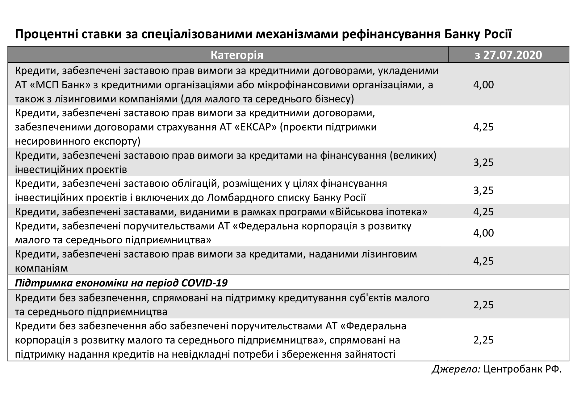 - механізм надання кредитів Банком Росії, забезпечених заставою прав вимоги за кредитами, залученими на здійснення інвестиційних проєктів, і механізм надання кредитів Банком Росії, забезпечених заставою облігацій, розміщених у цілях фінансування інвестиційних проєктів;