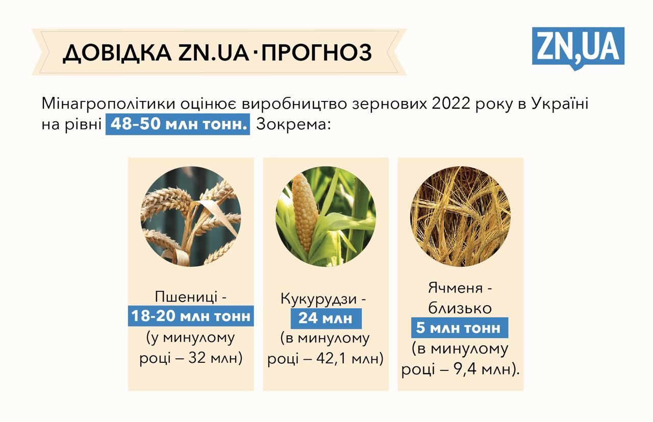 За даними Державної митної служби, Україна в 2021/2022 маркетинговому році (станом на 10 червня) експортувала понад 47 млн тонн зернових. Зокрема, пшениці продали 18,6 млн тонн, кукурудзи — 22,6 млн, ячменю — 5,7 млн, жита — 161,5 тис. тонн.