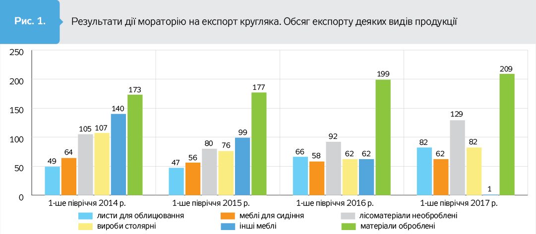 Проте, коли Україна намагається реалізувати захисні механізми щодо власних галузей економіки, то це сприймається офіційними органами ЄС як порушення вимог про недопустимість торговельних бар'єрів. Показовим є приклад, пов'язаний із запровадженням Україною з 1 листопада 2015 р. мораторію на експорт деревини у необробленому стані (зокрема, лісу-кругляка). На рис.1 подано інформацію щодо його позитивної дії.