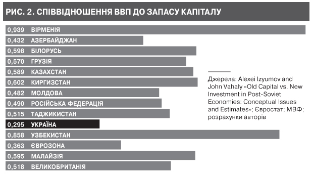 Прискорена індустріалізація за визначенням потребує від самого початку низького рівня запасу капіталу в перерахунку на одного працівника. Однак цей показник в Україні (приблизно 41 тис. у доларах 2000 року) є одним із найвищих серед пострадянських країн і приблизно дорівнює рівню Малайзії - країни, що вже пройшла етап індустріалізації (див. рис. на сайті DT.UA). Майже аналогічні й цифри по Китаю, де спостерігається зниження віддачі на новий капітал. Таким чином, запас капіталу в Україні є вже доволі великим (нехай його і не порівняти з розвиненими країнами), що закриває для нас можливість прискореної індустріалізації. Однак віддача на капітал, розрахована як співвідношення ВВП до запасу капіталу (див. рис. 2) , яскраво ілюструє проблему української економіки - величезну неефективність, спричинену жахливою якістю інституцій і структурними проблемами. Якщо орієнтовною нормою показника, що працює й на пострадянському просторі, є 0,5-0,6, то в Україні він дорівнює 0,3. Віддача на капітал у нашій країні є аномально низькою. Теоретично можна було б списати це на технологічне відставання й невдалу структуру економіки.Однак інші пострадянські країни зі схожою сировинною орієнтацією й аналогічним (а то й гіршим) рівнем використовуваних технологій таких проблем не мають. Отже, справа саме в українській специфіці. Ми маємо глибші структурні проблеми, ніж наші сусіди по пост-СРСР. Стандартні пострадянські проблеми - корупція, недосконале законодавство й регулювання, поганий захист прав власності, загалом, усе те, що ми називаємо низькою якістю інституцій, - у нашій країні поєднуються із фантастично низкою енергоефективністю та залежністю від імпорту дорогих енергоносіїв, а також із наявністю цілих збиткових галузей, субсидованих державою (передусім вугільної).