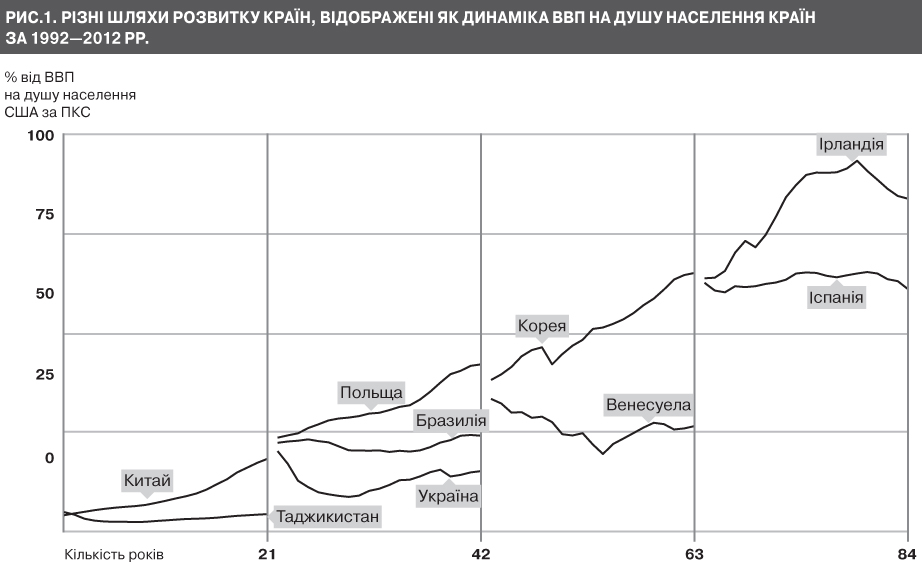 На рис. 1 схематично зображено шляхи, якими пішли різні групи країн, що починали свій сучасний етап розвитку у 1992 році приблизно з однакових позицій. Перша група - Китай і Таджикистан, які 1992 року були на рівні 5% від ВВП на душу в США. Друга група - Польща, Україна й Бразилія (близько 20% від рівня США). Третя група - Південна Корея та Венесуела (близько 40% від США). Четверта група - Ірландія й Іспанія (близько 60% від США).У кожному з цих випадків має місце як успішне надолуження розриву до рівня США, так і невдале скочування в пастку середнього доходу. Звичайно, пастка захлопується, коли економічна система не здатна перебудуватися і перерозподілити ресурси від виробництва з низькою доданою вартістю до виробництва з високою доданою вартістю, ефективніше використовуючи свій "бюджет".
