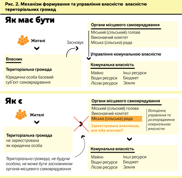 Було здійснено фактично чи то грандіозне недбальство чи то державний злочин, коли замість заснування територіальних громад та юридичного закріплення за ними прав власності на землю, ліси, водойми та комунальне майно, права на об'єкти комунальної власності юридично закріпили за органами місцевого самоврядування. Оскільки громади не могли стати засновниками органів місцевого самоврядування, ними в установчих документах зазначені фізичні особи, міськвиконкоми чи навіть... Закон України "Про місцеве самоврядування". Хоча згідно з Конституцією це можуть бути виключно територіальні громади.