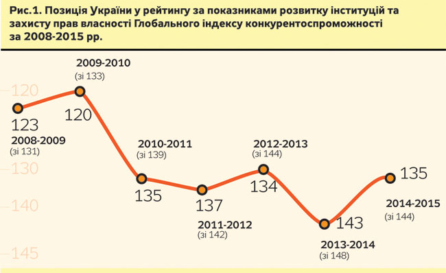Чи цікавилися ви, чому за індикатором "право власності" Глобального індексу конкурентоспроможності Україна входить до десятки країн, де це право найменше захищене, і ми на одному рівні щодо захисту права власності з Бурунді, Зімбабве, Чадом (рис. 1)?
