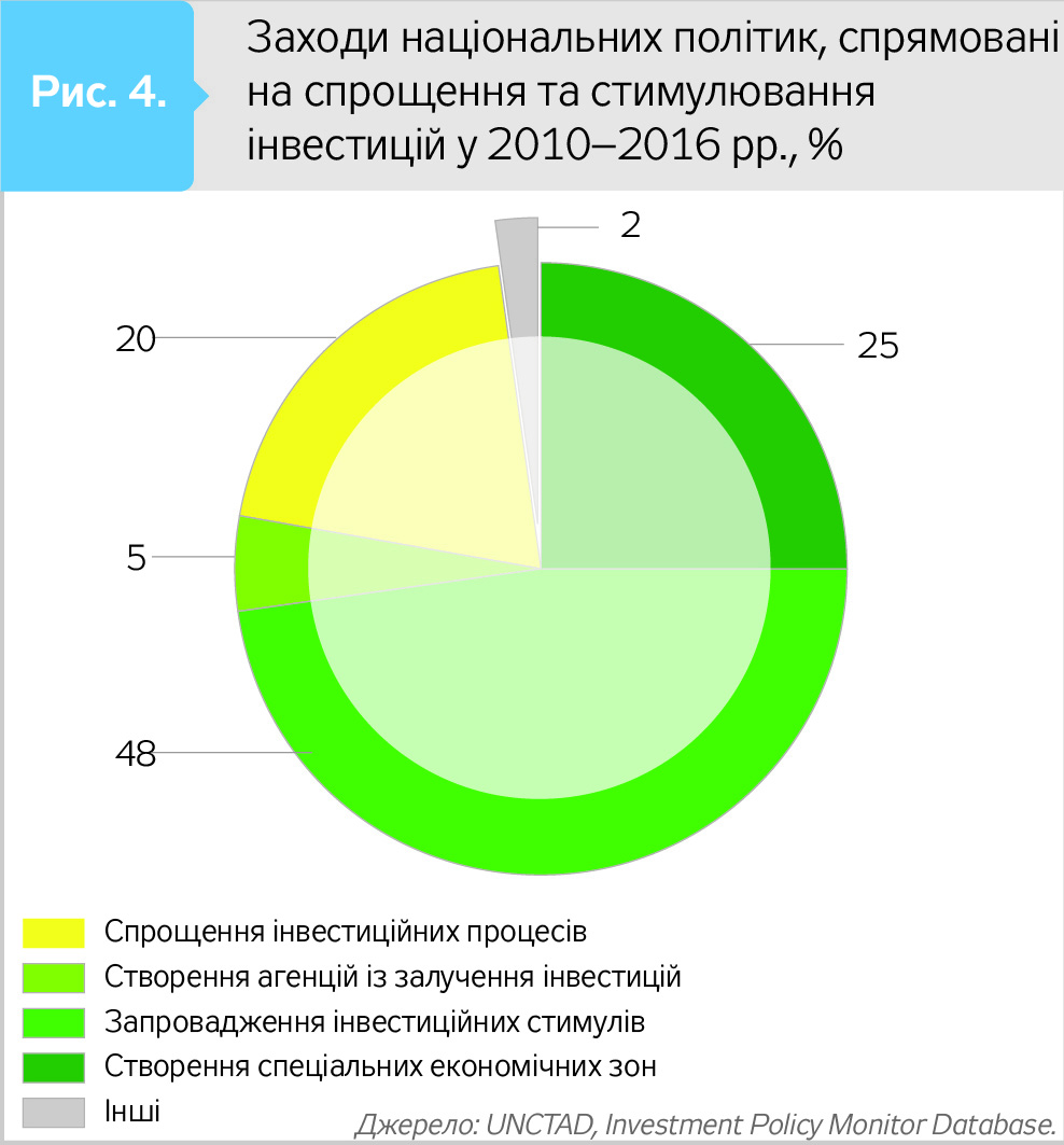 Проте у сучасному світі ці необхідні умови для залучення інвестицій є недостатніми, і це підтверджує статистика. Україна відмовилася від спеціальних економічних зон, а 25% усіх державних інвестиційних політик світу їх використовують. У нашій країні немає системи інвестиційних стимулів, окрім точкових преференцій, а 48% країн їх активно застосовують (рис. 4).