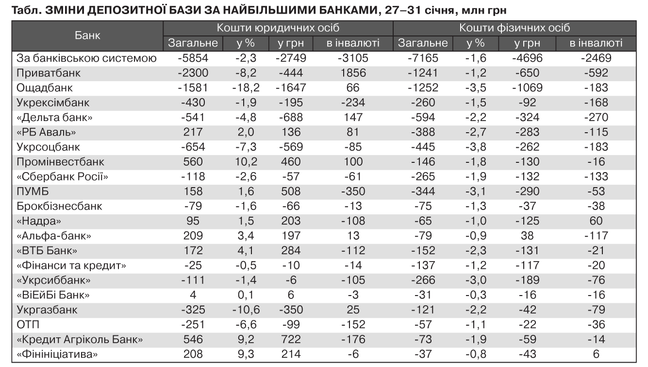 До падіння на валютному ринку додалося наростання напруги з депозитами банків. Злякавшись девальвації та чуток про те, що Нацбанк знову обмежить можливості дострокового зняття депозитів, українці активно почали виводити їх із банків. За інформацією DT.UA, за п'ять останніх днів січня, з 27-го по 31-ше, відплив депозитів фізосіб загалом по банківській системі становив майже 7,2 млрд грн. Що не так уже й багато у відносному вираженні (1,6%), але з початку нинішнього тижня відплив, мабуть, посилився.