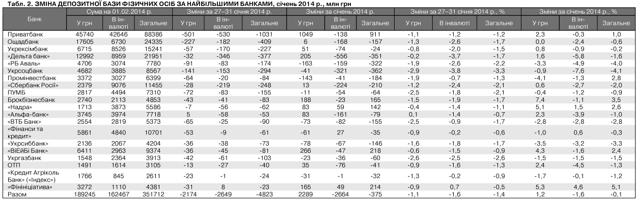 Особливо це має порадувати, до речі, саме голову правління Приватбанку О.Дубілета, а також керівництво державного Ощадбанку. В останні п'ять днів січня - у міру наростання паніки на валютному ринку - саме клієнти-фізособи цих двох фінустанов вивели з них по 1,2 млрд грн депозитів (хоча загалом із початку 2014 р. "Приват", на відміну від "Ощаду", показав приріст депозитної бази на 0,9 млрд грн - див. табл.).