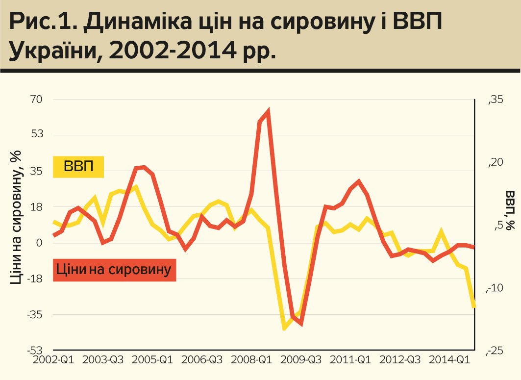 Втративши колишню технологічну базу, вітчизняна економіка опинилася прив'язаною до світової кон'юнктури на сировину. На рис. 1 наведено річну динаміку цін на експортовані Україною сталь, пшеницю, азотні добрива й соняшникову олію, а також її ВВП (у поквартальній розбивці). Зазначений рисунок - азбука зльотів і падінь української економіки: якщо перші чітко корелюють зі зростанням цін на сировину, то другі - з їх зниженням. Це пояснює, чому єдине стійке піднесення у незалежній Україні припало саме на 2000–2007 рр., хоча навряд чи тоді кумівства, корупції, фальсифікату, контрабанди й політичних чвар було менше, ніж зараз. Його причина цілком банальна: в основі тодішнього зростання лежали не реформи, не особливий бізнес-клімат і не добра воля українських політиків, а незалежний від них злет цін на сировину.