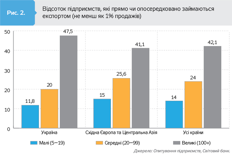 Проте розробники стратегії тверезо оцінюють, що українська економіка характеризується високим рівнем відкритості (інтегрованістю у світову економіку) і залежністю українських виробників від торгівлі на іноземних ринках. А високий рівень відкритості робить країну уразливою, оскільки нестабільність на світових ринках моментально позначається на економіці такої країни. Для активного включення в глобальні ланцюги доданої вартості пропонують перейти до виробництва середньо- і високотехнологічної продукції. Але радикальних рішень уникають. Хоча технологічна складова - це лише 5% українського експорту, тоді як в інших країнах, що розвиваються, частка такої продукції в середньому становить близько 35%.