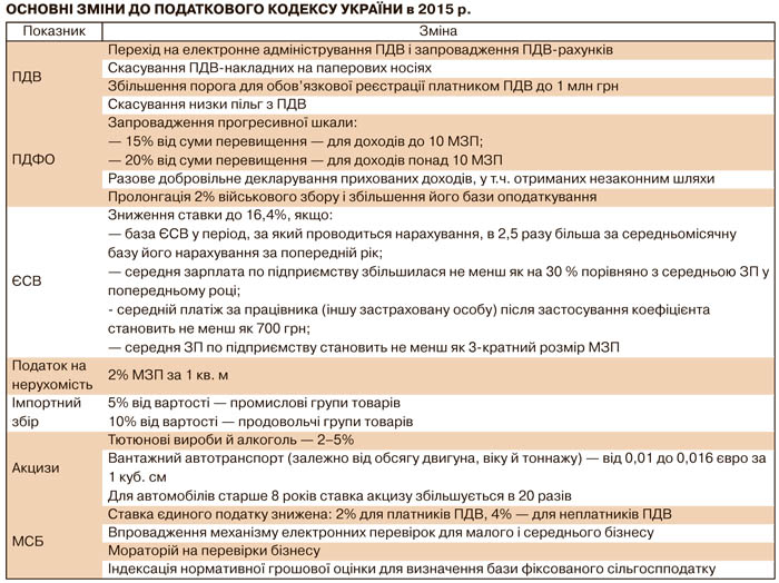Головними викликами 2015-го для українського бізнесу стануть не війна та криза, а податки. Вирішивши залучити до бюджету-2015 на 98 млрд грн більше, ніж 2014-го, уряд зламав через коліно багатьох підприємців, оскільки реалізовувати амбіційні плани з наповнення держскарбниці будуть саме платники податків, а не Кабмін. Бізнесу доведеться віддавати останню сорочку, і жодних поліпшень для його роботи не буде. Податкова реформа істотно підвищила фіскальний тиск, при цьому не спростивши, а ускладнивши адміністрування податків і зборів.