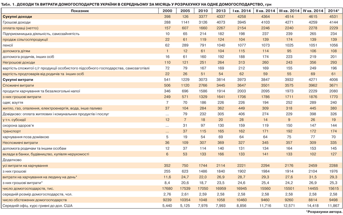 При проведенні обстежень домогосподарств спочатку збирають дані про витрати й лише потім, щоб у принципі виключити можливість підігнати витрати під доходи, інформацію про доходи. Тому є деякі відмінності між загальною величиною доходів і витрат. Але логічніше й природніше почати з характеристики доходів і потім перейти до витрат домогосподарств. У стислому вигляді ці відомості подано в табл. 1. У ній наведено дані за чотири попередні роки з початку обстеження, поквартальні дані за 2014 р. і розраховані автором (до остаточних річних публікацій) середні дані за минулий рік. Отут важливо наголосити, що оплата праці показується в чистому вигляді, тобто за винятком податків та інших обов'язкових утримань. А пенсії, доходи за депозитами минулого року (на відміну від нинішнього) податками ще не обкладалися. Усі дані обстежень стандартно наводяться в середньому на одне домогосподарство в розрахунку на місяць, а не на квартал. Ми додатково розрахували сукупні й грошові витрати на харчування на одного члена домогосподарства на день, які легше сприймаються, ніж щомісячні величини.