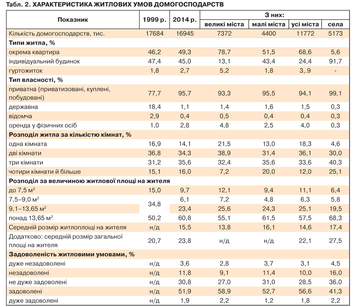 У програмі обстежень домогосподарств велика увага приділяється характеристиці житлових умов. Основні дані про них подано в табл. 2. Але, крім зібраної в таблиці інформації, в результатах обстежень наводяться й інші дані, зокрема про забезпеченість житла комунальними зручностями (за 12 позиціями), зокрема опаленням і газом, що набуває особливої значущості у світлі нинішнього й подальшого різкого підвищення тарифів на ці послуги.