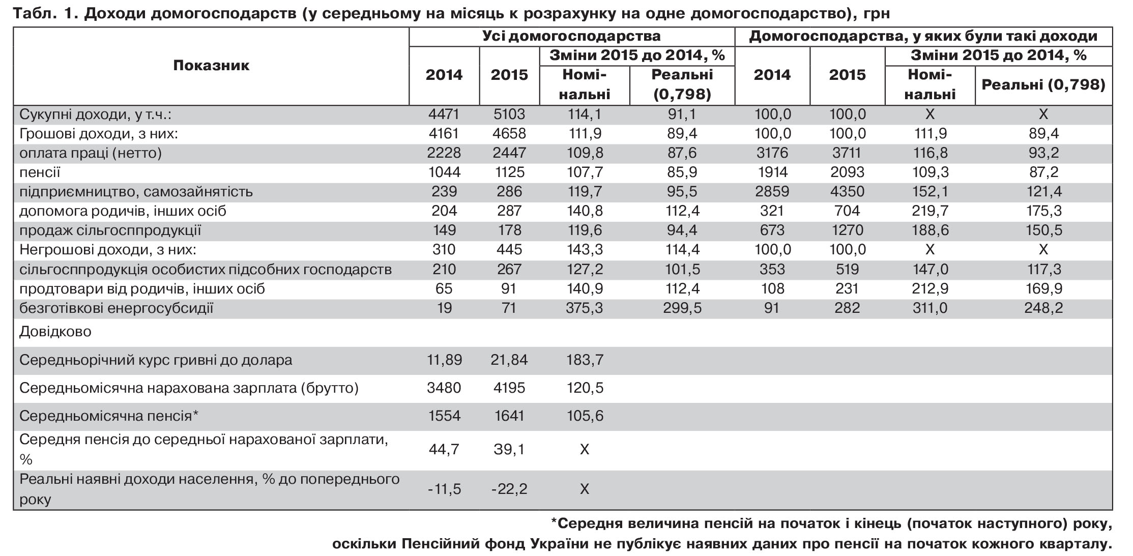 До даних табл. 1 можна додати, що в 2015 р. зарплату одержували 66% домогосподарств, пенсію - 54, грошову допомогу від родичів - 41, доходи від продажу сільгосппродукції - 14, а від підприємництва та самозайнятості - 6,5% домогосподарств.