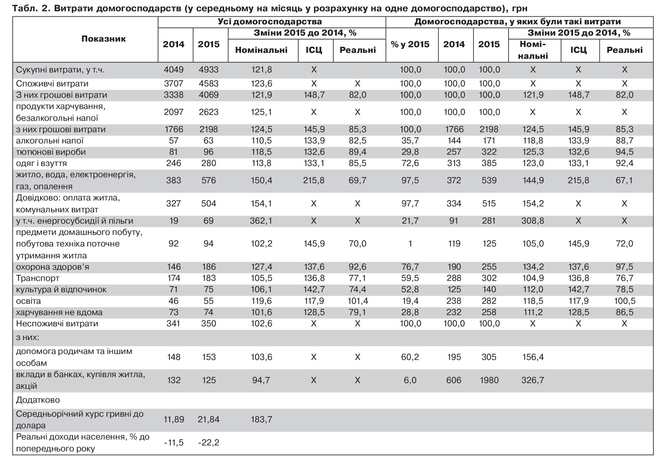 Істотне реальне скорочення в 2015 р. доходів домогосподарств не могло не спричинити й реального скорочення їхніх витрат (табл. 2). Оскільки дані обстежень домогосподарств проводяться в поточних цінах, провести перерахування в постійні ціни за офіційним ІСЦ можна лише в частині грошових споживчих витрат. Але вони становлять 82,5% усіх сукупних витрат і цілком придатні для загальних оцінок.