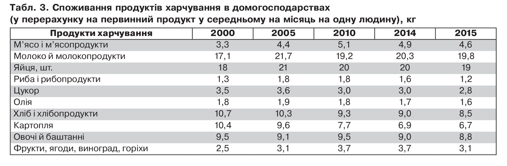 Щодо продуктів харчування доцільно замість оперування грошовими показниками навести дані про їхнє споживання в натурі. У 2015 р., як показано в табл. 3, споживання всіх продуктів харчування порівняно з попереднім роком скоротилося. Особливо значне скорочення по рибі та рибопродуктах, переважно імпортних, по яких середньорічний ІСЦ особливо зріс (160,9%, порівняно з 145,9% по всіх продуктах харчування та безалкогольних напоях), а також фруктах, ягодах, винограду, де також велика імпортована частина (172,4%).