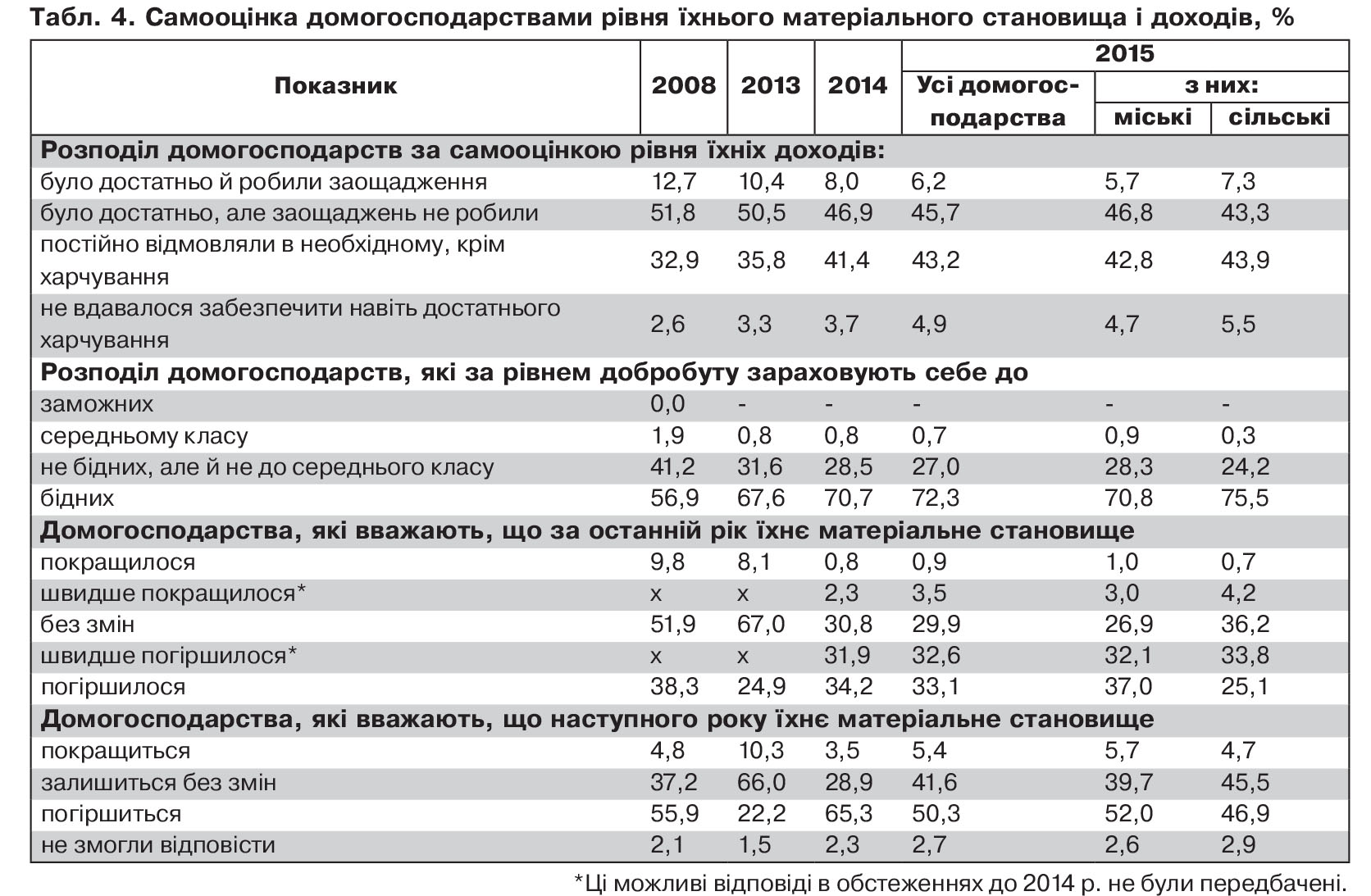 У рамках обстеження умов життя домогосподарств Держстат проводить щорічні вибіркові обстеження самооцінки рівня доходів. Останнє обстеження проводилося в січні 2016 р., і його підсумки опубліковано наприкінці червня. Дані ґрунтуються на суб'єктивних визначеннях - чи достатньо одержуваних доходів для задоволення основних потреб і ряду інших близьких до цього показників. Основні підсумки останнього обстеження наведено в табл. 4.
