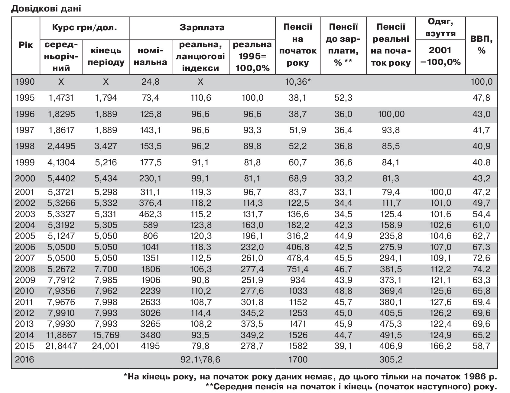 При такій повально несприятливій динаміці самооцінок населення набагато оптимістичніше виглядають офіційні показники реальної зарплати, пенсій і наявних доходів. Вони визначаються за динамікою цих показників у поточних цінах, скоригованих на індекси споживчих цін, правдивість яких викликає чималі сумніви. За ними, наприклад, виходить, що найвища реальна зарплата була у 2013 р., перевищуючи реальні показники 1995 р. у 3,73 разу, а за реальними пенсіями ще більше - аж у 4,91 разу. У 2015-му з падінням економіки за ці два роки зростання виявляється меншим - 2,79 разу за реальною зарплатою та 3,05 разу за реальними пенсіями. Це означає, що 1995-го вони були в стільки ж разів нижчими за незадовільний нинішній рівень. Можна додати, що за статистикою реальна зарплата штатних працівників у 2015 р. була нібито навіть на 0,5% вища, ніж у найбільш сприятливому 2008 р. Може, за межами України хтось і повірить цим цифрам і навіть заздритиме та захоплюватиметься ними. Але в нас у країні вірити в реальність цього багаторазового зростання навряд чи хтось наважиться. Давайте подумки перенесемося на 20 років назад, спробувавши уявити та осмислити, що тоді життєвий рівень працюючих і пенсіонерів був ще в чотири-п'ять разів нижчим, ніж незадовільний нинішній.