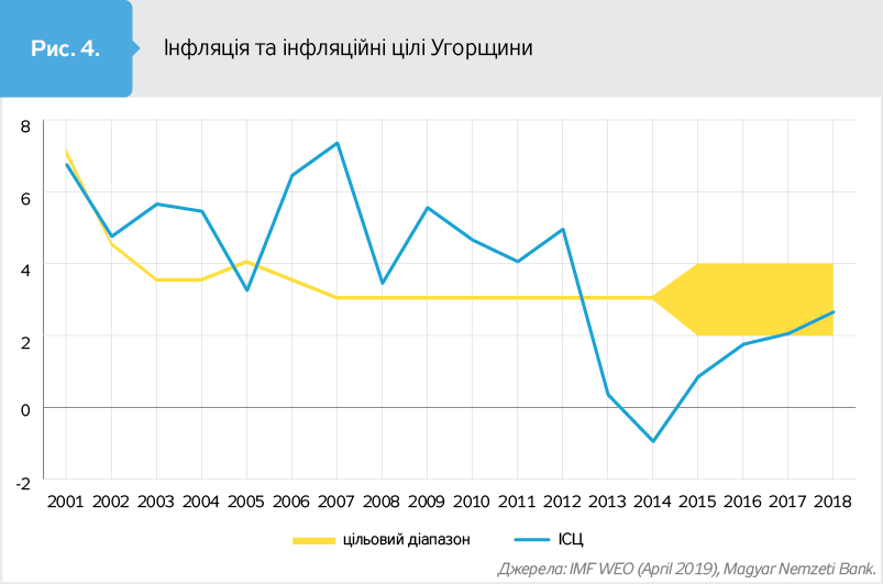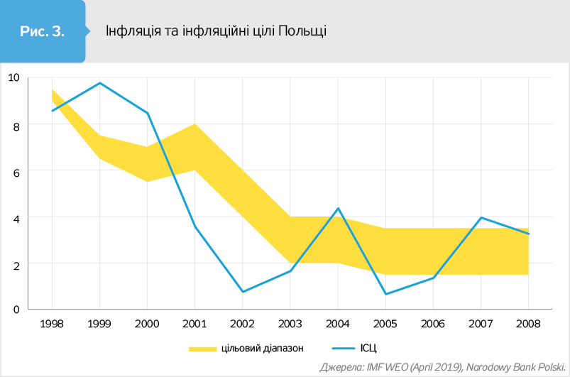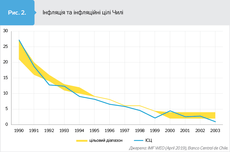 І, як бачимо, і в інших країнах, що перебували на початковому етапі інфляційного таргетування, незважаючи на відхилення фактичного зростання цін від цільових параметрів, загальний тренд був на її зниження (див. рис.). Це допомагало стабілізувати економіку і, за умови здійснення структурних реформ, забезпечити стійке економічне зростання.