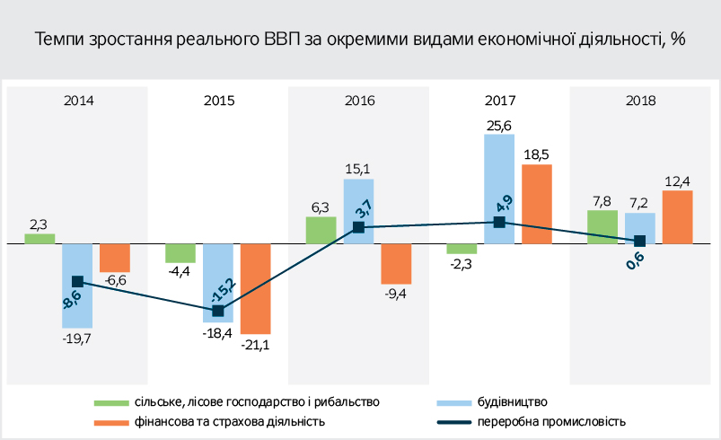 Після значного економічного спаду у 2014–2015 рр. (падіння ВВП на 15,8%) у 2016-му почалося повільне відновлення економічної діяльності. Але в 2018 р. реальний ВВП України все ще був на 8,7% меншим, ніж 2013-го. При цьому внаслідок значної варіації темпів економічного зростання у складі ВВП відбувалися помітні структурні зміни за видами економічної діяльності. Так, торік обсяги виробництва в сільському господарстві перевищили рівень 2013-го на 9,5%, у будівництві - на 1,5%. В останні два роки активно зростали й фінанси та страхова діяльність.