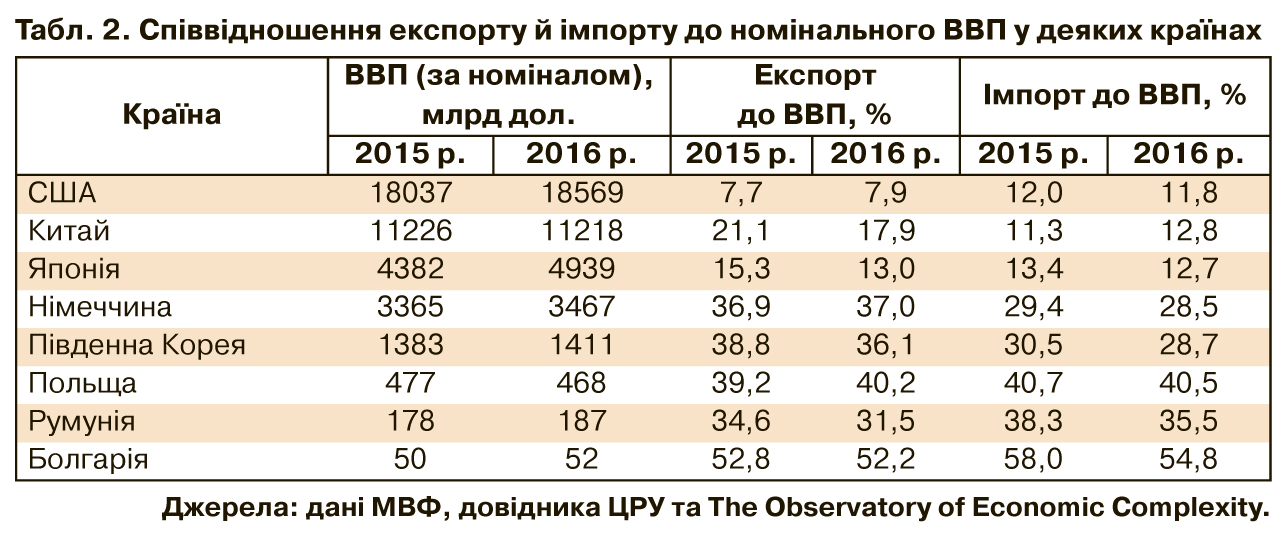 Для порівняння наведемо співвідношення експорту та імпорту до номінального ВВП у деяких інших країнах (табл. 2).