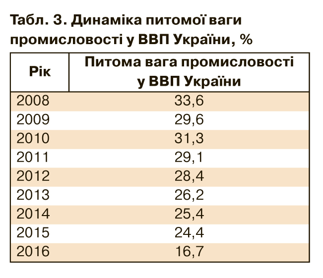 І щоб закінчити з цифрами, табл. 3 показує динаміку питомої ваги промисловості у ВВП нашої країни.