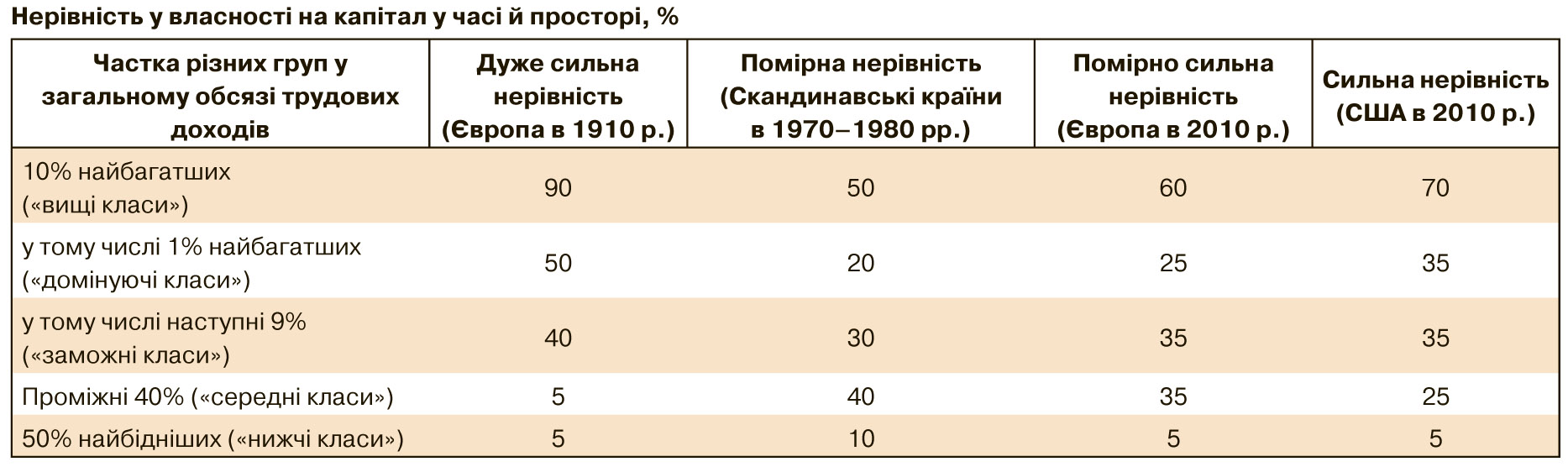 Автор "Капіталу" пропонує подивитися в таблиці (наведена тут скорочено), як змінювалася власність цих груп протягом останніх ста років.