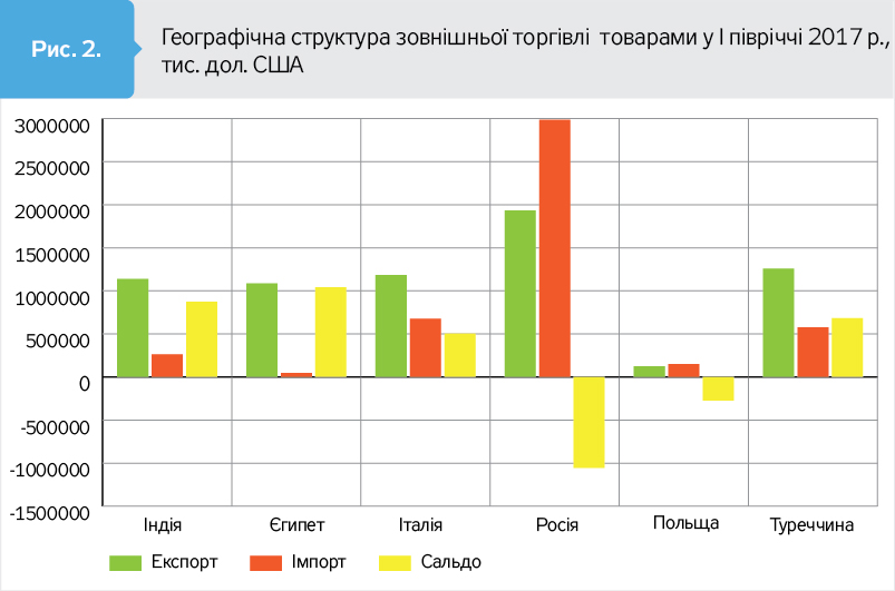 Географічна структура експорту також не зазнала особливих змін. На даний момент його максимальний обсяг припадає на Росію. Слідом за нею йдуть Італія, Польща, Туреччина, Індія та Єгипет. Саме в ці регіони ми продали найбільше товарів за поточні шість місяців. Досягти таких значень змогли за рахунок зростання обсягів експорту в середньому на 25% у ці регіони. Але разом з цим зростає і обсяг імпорту - на 29%.