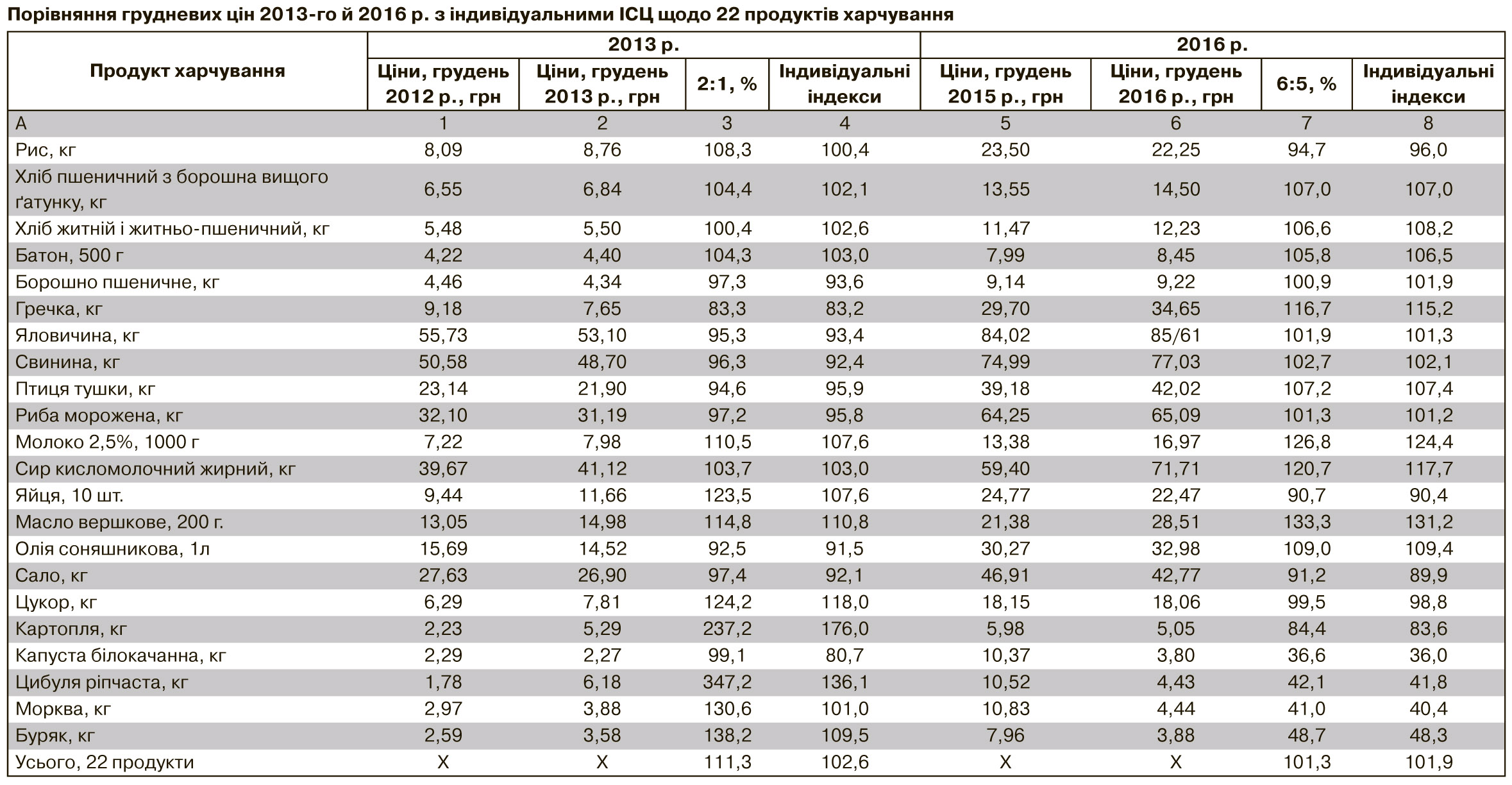 Мабуть, із прийняттям у 2014–2015 рр. змін у методиці розрахунків ІСЦ, особливо відносно визначення індексів по плодоовочевих продуктах, якість наших індексів, їхня вірогідність помітно поліпшилися. Про це, зокрема, можна судити за наведеним в таблиці порівнянням змін цін з індивідуальними індексами за 2013-й і 2016 р. по 22 продтоварах.