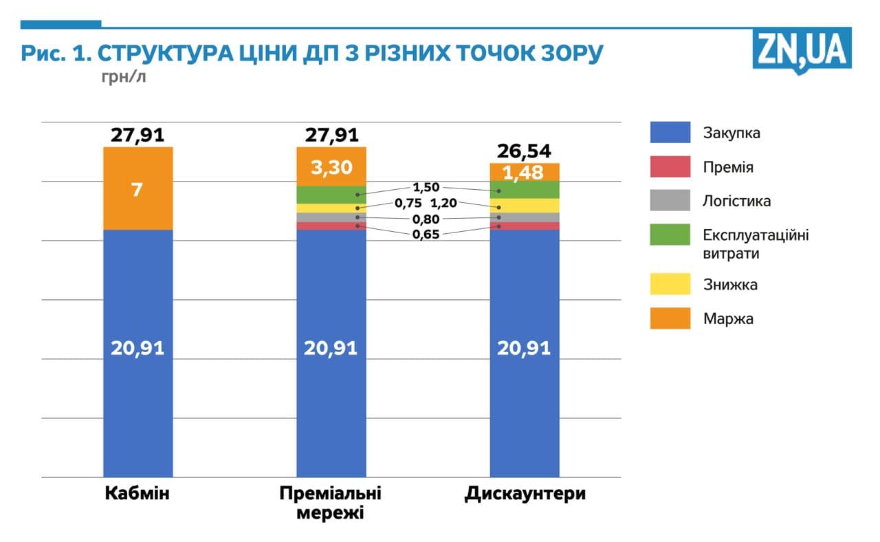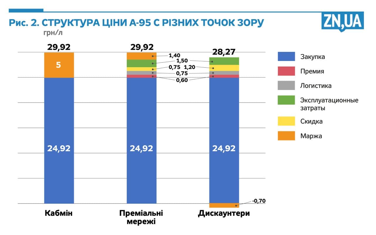 Однак більш цікава картина в дискаунтерів. Якщо всунути в їхню ціну «кабмінівську» закупівельну ціну та інші зрозумілі параметри, то отримаємо, що продаж кожного літра бензину приносить їм 70 коп. збитків, дизпалива — 1,5 грн/л прибутку. Тут слід також внести ясність: мається на увазі, що мова про продаж заводського продукту з видачею чесного фіскального чека. І от у цьому вся сіль.