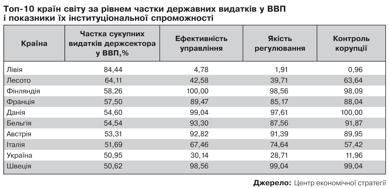 Економісти давно дійшли висновку, що частка державних видатків у ВВП має оптимальний рівень. І при його перевищенні економічне зростання сповільнюється, а з урахуванням ще й низького рівня інституціональної спроможності держави, як у випадку з Україною, цей вплив посилюється. За показниками інституціональної спроможності World Governance Indicators Світового банку Україна відчутно відстає від розвинених країн, які мають порівнянний із нашою країною рівень перерозподілу ВВП через державні видатки (див. табл.).