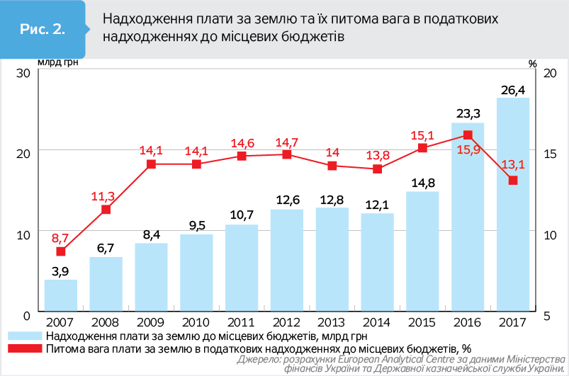 Плата за землю (земельний податок та орендна плата за землю) виступала й виступає однією з основних складових податкових надходжень до місцевих бюджетів. У 2007 р. питома вага плати за землю в структурі податкових надходжень у місцеві бюджети становила 8,7%, у 2015-му - 15,1, а у 2017-му - 13,1% (див. рис. 2).