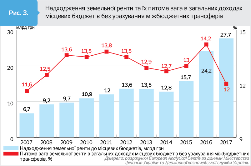 Нинішній звужений інституціональний люфт користування та розпорядження комунальними землями й землями загалом у межах і поза межами населених пунктів забезпечив у 2017 р. 12-відсоткову питому вагу земельної ренти (плата за землю плюс надходження коштів від продажу землі) у структурі загальних доходів місцевих бюджетів без урахування міжбюджетних трансфертів (див. рис. 3).