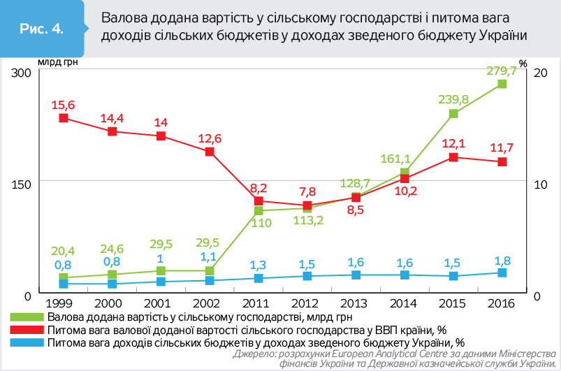 Питома вага валової доданої вартості сільського господарства у ВВП країни у 1999 р. становила 15,6%, у 2002-му - 12,6, у 2016-му - 11,7%. У 2016 р. порівняно з 1999-м і 2011 р. валова додана вартість у сільському господарстві збільшилася в рази. Зате питома вага доходів сільських бюджетів у доходах зведеного бюджету України коливалася в межах 0,8–1,8%.