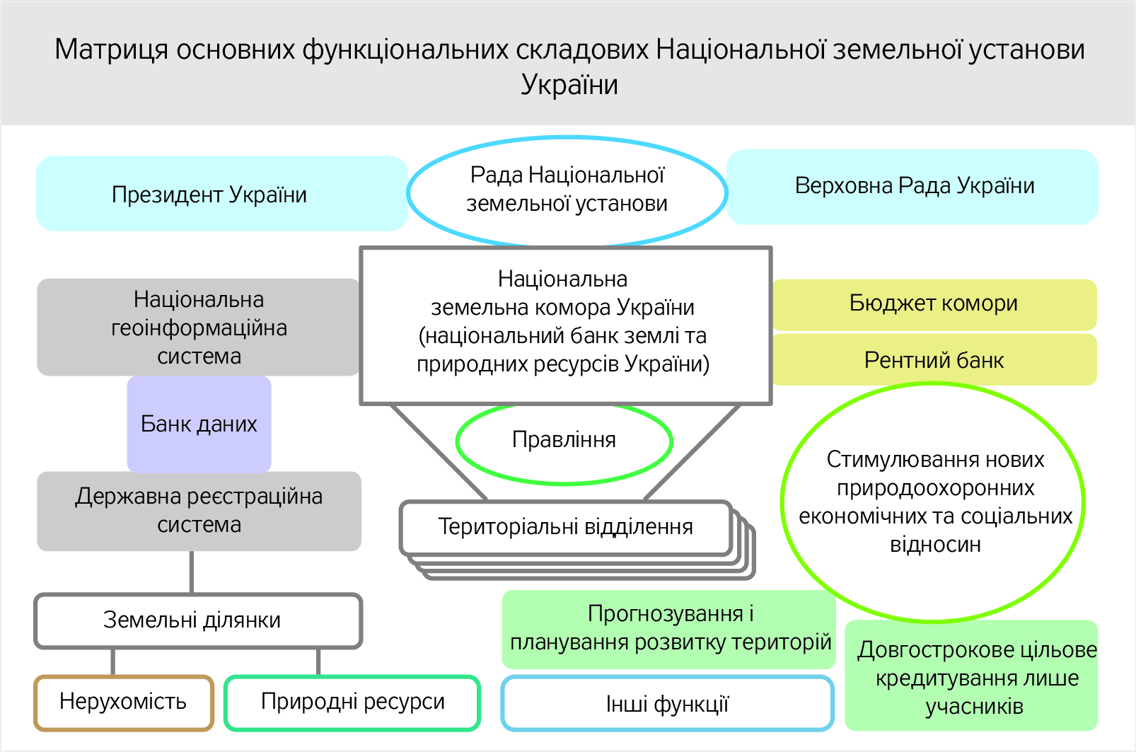 Така національна земельна установа має виконувати роль утримувача землі та її природних ресурсів, здійснювати державну реєстрацію земельних ділянок і нерухомого майна та природних об'єктів, пов'язаних із ними, та прав власності на них, а також від імені держави забезпечувати і гарантувати права власності, вести прозорі та відкриті кадастрові й реєстраційні системи тощо. Ця установа як інститут, на відміну від інших, матиме свій бюджет і складовий рентний банк і виконуватиме багатоцільові функції та завдання, не притаманні Національному банку України, державному бюджету України та комерційним банкам. Діятиме національний регуляторний принцип, за яким платять сповна всі, хто користується природними об'єктами прав власності українського народу, і одержують необхідну підтримку (допомогу) лише ті, хто є активним учасником здійснення земельної реформи. Наприклад, основним чинником на етапі організації та становлення господарств фермерського типу (власник-господар) у сільській місцевості є створення безперешкодних і прозорих умов одержання ними вигідної фінансової допомоги на умовах співучасті бюджету пропонованої установи.