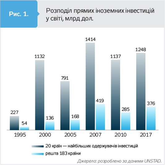 Світовий ринок прямих іноземних інвестицій дуже монополізований. Лише 20 країн світу отримують близько 80% усіх інвестицій, а решта 20% дістаються 183 країнам (див. рис. 1). Але серед останніх є 33 країни з рейтингом А-ААА, які залучають близько половини з цих 20% інвестицій. З того, що залишилося, значну частину одержують 73 країни з рейтингом В-ВВВ. Решта 77 країн конкурують за останні "крихти" інвестицій. І ця тенденція не змінюється вже 20 років!