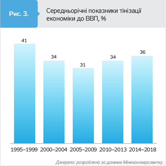 Перша - детінізація економіки. Найбільш істотним джерелом зростання ВВП, без великих додаткових витрат, є детінізація економіки. Зниження рівня економіки в "тіні" до 10% - середнього по ЄС, дало б можливість значно наблизитися до задекларованого прогнозу. За президентства Л.Кучми, завдяки дерегуляції економіки, зниженню податкового навантаження, лібералізації фіскальних, реєстраційних, ліцензійних, дозвільних, сертифікаційних режимів і процедур, за 2000–2004 рр. з "тіні" вдалося вивести 7% економіки. Адже у 90-х роках під сильним тиском кризи економіку було глибоко загнано в "тінь". Але за наступні 15 років ситуація тут практично не змінилася (див. рис. 3).