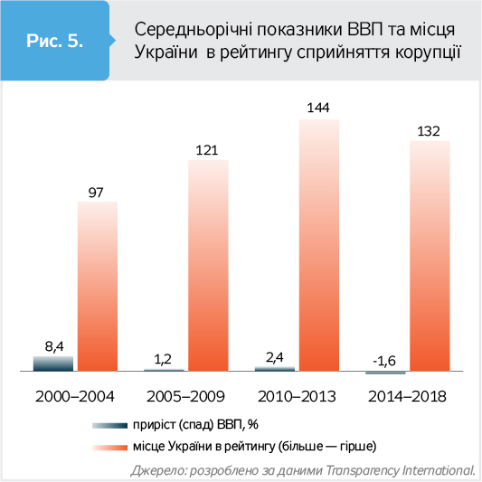 Третя - поглиблення реформ. В українському суспільстві залишається великий запит на реформи для зростання економіки. Перш за все це стосується антикорупційної реформи. За підрахунками фахівців, щорічне корупційне навантаження на економіку сягає 5–7%. Це реальний потенціал для зростання ВВП. Хоча витрати на антикорупційну реформу поки що достатньо великі, а її ефективність досить низька. Так, за останні три роки в Україні створено п'ять антикорупційних органів (НАЗК, НАБУ, САП, ВАСУ і ДБР) з бюджетними видатками на їх утримання в межах 3–5 млрд грн на рік. Але рівень корупційності економіки, за оцінками міжнародних рейтингів, не знизився. Водночас зростання ВВП навіть на 1% за рахунок зниження корупції здатне окупити понесені витрати. Адже в Україні рівень корупції дуже корелює з рівнем ВВП (див. рис. 5). У разі зниження рівня сприйняття корупції вдвічі можна розраховувати на 3–4% приросту ВВП.