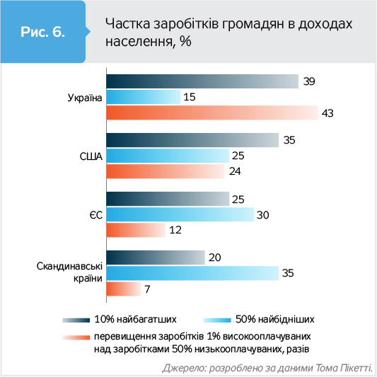 Нарешті, принципово важливо, наскільки соціально справедливо розподіляється ВВП між громадянами. В Україні тут чимало проблем. За даними французького дослідника Тома́ Пікетті́, заробітки 50% найбідніших у структурі загальних заробітків населення становили: в Скандинавських країнах - 35%, у ЄС - 30, у США - 25, а в Україні - лише 15%. Натомість заробітки 10% найбагатших становили: в Скандинавських країнах - 20%, у ЄС - 25, у США - 35, а в Україні - аж 39%. У Скандинавських країнах заробітки 1% високооплачуваних працівників перевищують заробітки 50% низькооплачуваних у 7 разів, у ЄС - у 12, у США - в 24, а в Україні - аж у 43 рази (див. рис. 6). В Україні показники соціальної та майнової нерівності не поліпшуються з 2007 р. А в 2014–2019 рр. влада свідомо пішла на ще більшу лібералізацію доходів окремим високооплачуваним категоріям. Так, у 2018 р. 30 топ-менеджерів держкомпаній отримували доходи від 100 тис. до 2 млн грн на місяць.