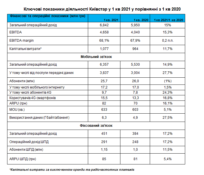 Київстар прискорив будівництво мереж швидкісного інтернету, як результат кількість абонентів 4G збільшилась на 24,3%. Використання мобільного інтернету зросло на 27,5% на одного абонента. В 1 кв. 2021 року оператор збільшив на 11,7% капітальні витрати. Крім того, сплатив до державного бюджету податків і зборів на суму понад 2,3 млрд грн.