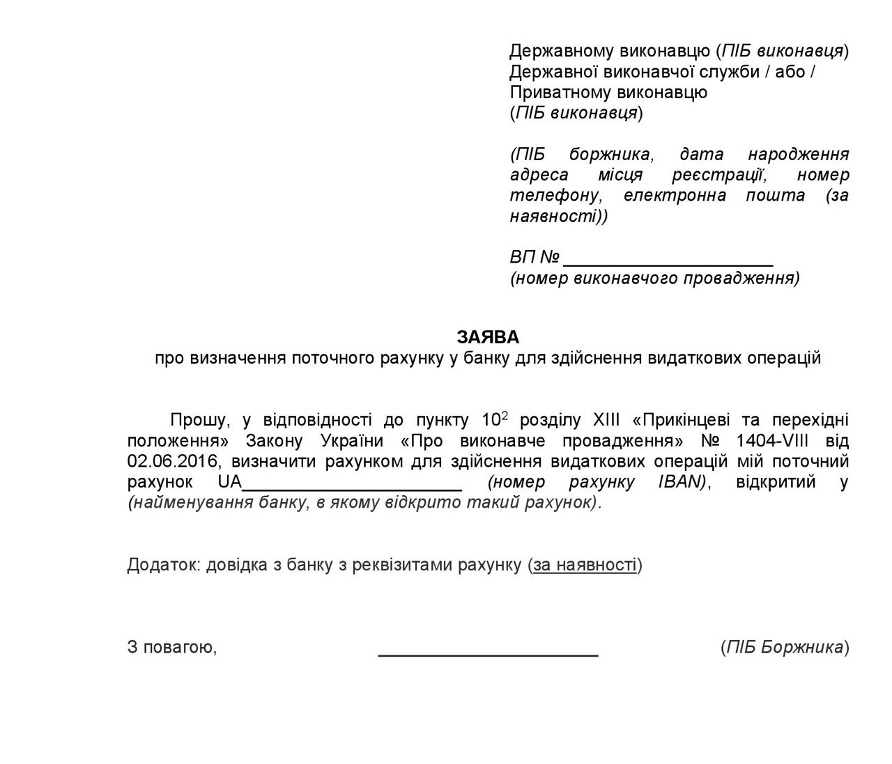 Використання коштів на банківських рахунках передбачає активні дії від фізичної особи-боржника, направлені на визначення поточного рахунку для здійснення видаткових операцій. Боржнику необхідно звернутися до органу державної виконавчої служби або приватного виконавця, який наклав арешт, із заявою про визначення поточного рахунку у банку для здійснення видаткових операцій (див. Зразок).