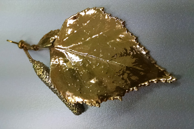 У колекції Миколиних робіт - бабка завдовжки 10 см, покрита шаром міді, сережки з покритих мікронним шаром металу листочків берези, намисто. Скляний свічник - одна з останніх робіт.