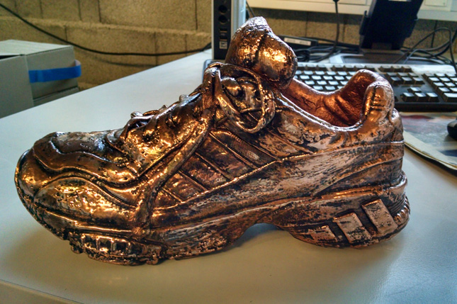 Хлопець узявся за роботу. Було непросто. Одне діло - невелика бабка, інше - кросівка 42 розміру. Зробив її на підставці. Кросівка, повністю покрита шаром міді, важить понад п'ять кілограмів. Осадження металу на такий великий обсяг забрало багато часу. Потім Микола шліфував кросівку, полірував, зробив темну патину, начебто взуття старе. Десь затемнював, десь висвітлював міддю. Використовував зелену мідну патину, коричневу, чорну. Ефект був приголомшливий!