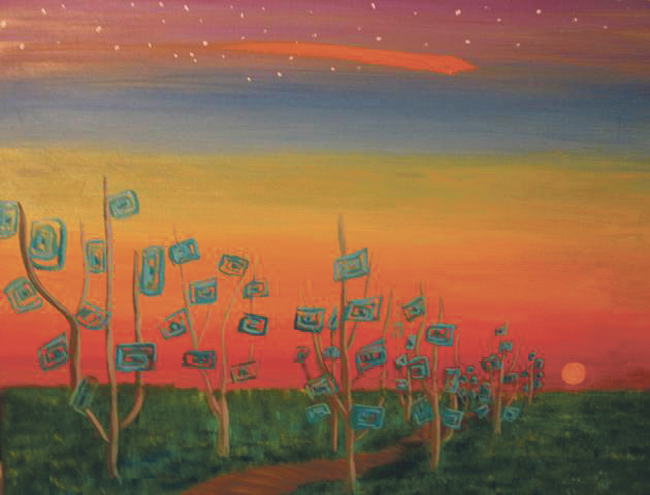 Серія "Планета Інгула" з геометричними зірками, квітами й такими ж деревами з'явилася за наполяганням Косаревського. Я довго копіювала і малювала життя таким, яким воно є. Та викладач радив, щоб я не просто перемальовувала, а щоб вигадувала свої сюжети.