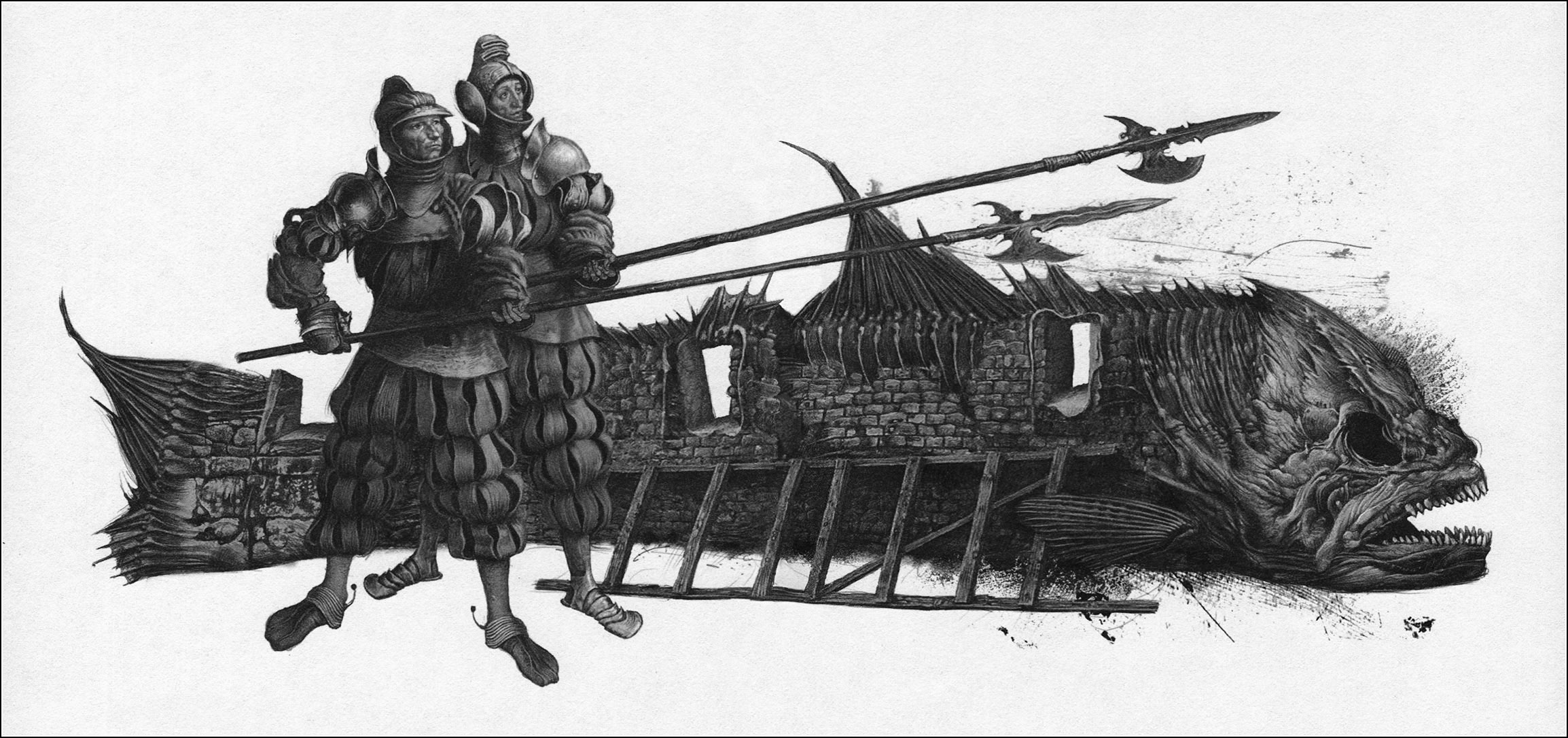 "Гамлет" видавництва А-БА-БА-ГА-ЛА-МА-ГА з'явився з того, що я намалював маленьку деталь. Нічого мені тоді не снилося. Та більшості художників нічого не сниться. Тебе просто тягне можливість рухатись. Тобі хочеться фактур, текстур, кольору, і ти починаєш малювати навіть якщо воно не пасує до книжки. От тобі хочеться малювати сталь і пір'я, і ти це малюєш. А ненормальні художники виконують логічну вправу.