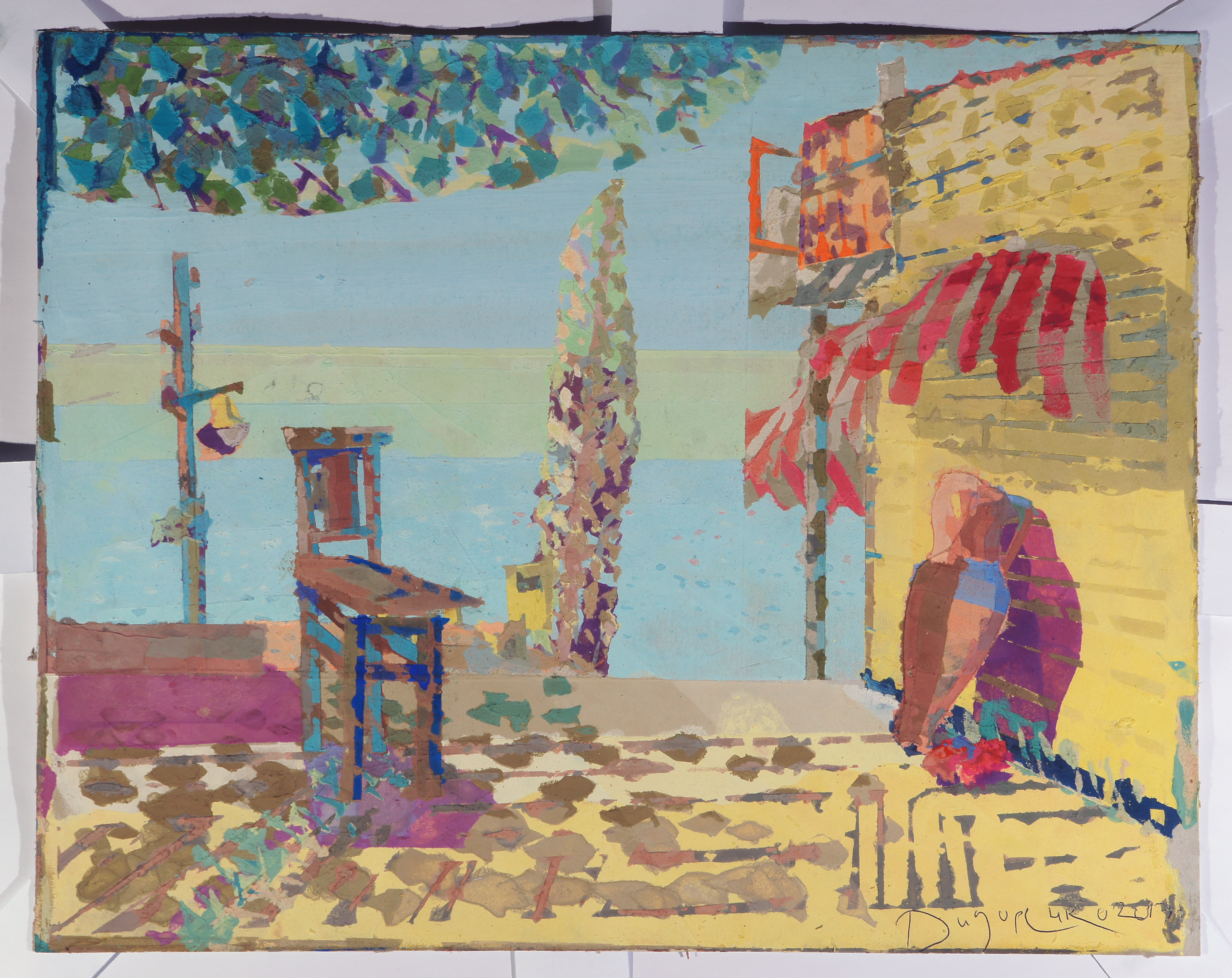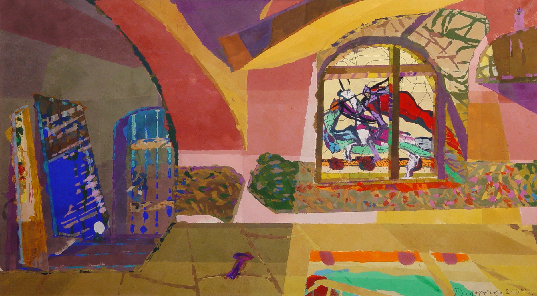 - Свої картини я створюю руками, використовуючи складну систему лекал, які мають вигляд одноразових трафаретів. Їх я вирізаю з ватману та фіксую клеєм на ребрі планшета. По черзі використовуючи, я відкидаю їх за межі картини. Надалі, для орієнтування на площині, можу прикласти їх назад і перевірити розташування плями. Практично, я відтинаю все непотрібне, залишаючи те, що хочу виразити кольорами. Потім багатошарові трафарети відпадають, як непотрібне лушпиння, і на світ з'являється картина. Ось і все.