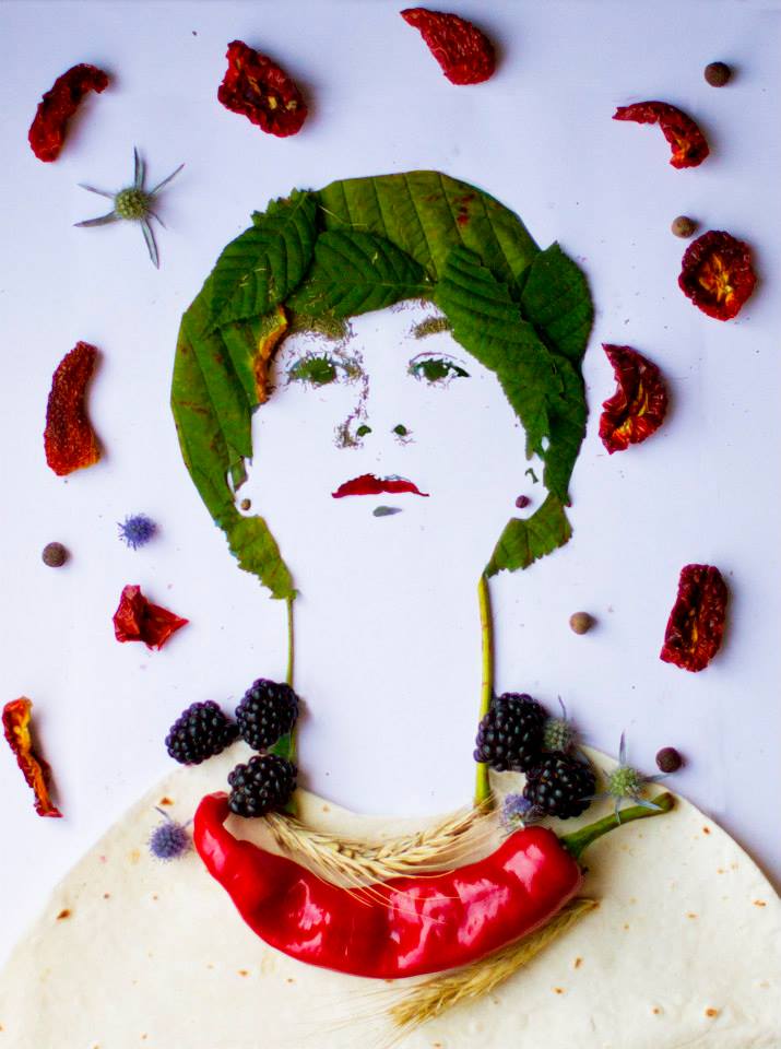 "Не уявляю свого альбому "Пані" без Іри - однієї з Panivalkova. Дівчатка, люблю вас - футболка з лаваша, волосся з листя каштана, в'ялені томати, перець-горошок, перець чилі, колоски, ожина, сушений кріп, пелюстка гладіолуса."
