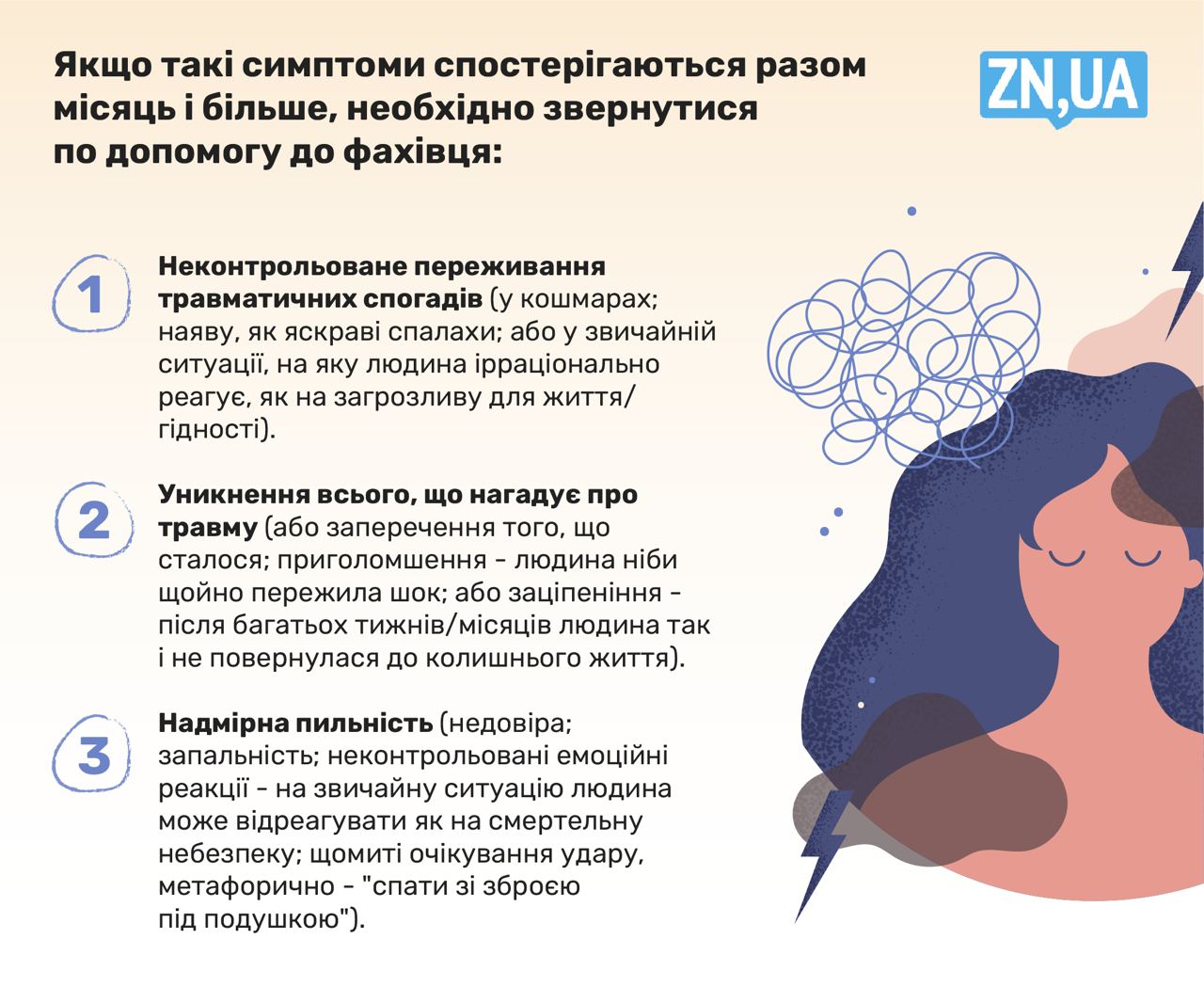 — Надійний критерій, який легко доводиться: порушуються чи руйнуються відносини з оточенням. При комплексному ПТСР це драматично виражено. Мозок людини з ПТСР продовжує жити у стані стресу й загрози. Іммобілізація не настає. Людині, яка переживає постстресову реакцію, передусім потрібно повернути собі відчуття безпеки та контролю над власним життям. Це вкрай складно, але якщо людина знає про симптоми ПТСР, знає, що цей розлад виліковний, вона цілком здатна усвідомити необхідність і користь звернення по допомогу.
