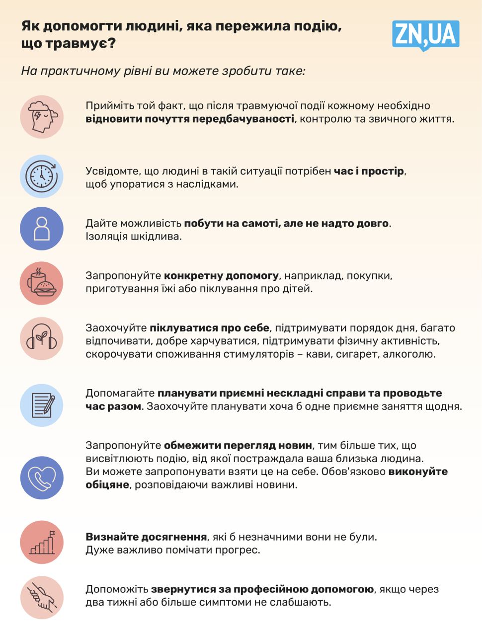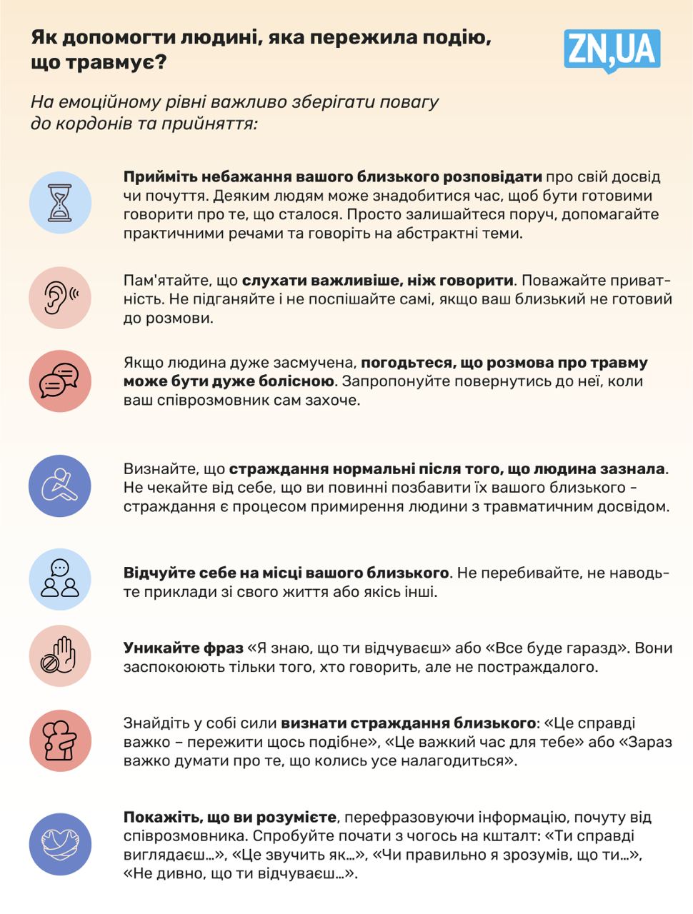 — Завжди враховувати фактор часу: скільки часу минуло після події. Якщо місяць — то, як я вже сказала, будь-які «ненормальні» реакції нормальні. Якщо минає два-три місяці, ми бачимо, що реакції стають хронічними, тоді потрібно, з одного боку, поважати право на приватність, не лізти постійно в душу, а домовлятися про те, що ми поговоримо на важливу тему. Робити це не настирливо, не травматично, але впевнено.