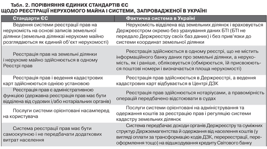 Ці дві системи в Україні мають працювати паралельно, що створює загрози для контрольованості ринку землі, а також труднощі при реєстрації угод для населення. При цьому передбачається, що державну реєстрацію прав має проводити нотаріус, що абсолютно не відповідає вимогам Євросоюзу до процедури реєстрації земельних ділянок.